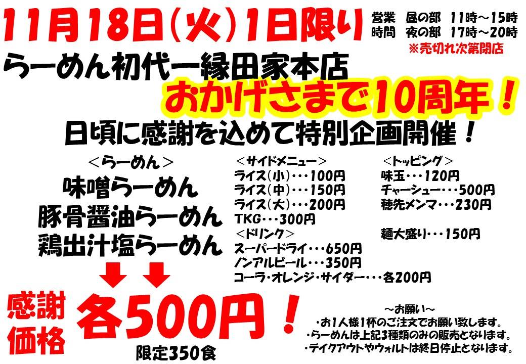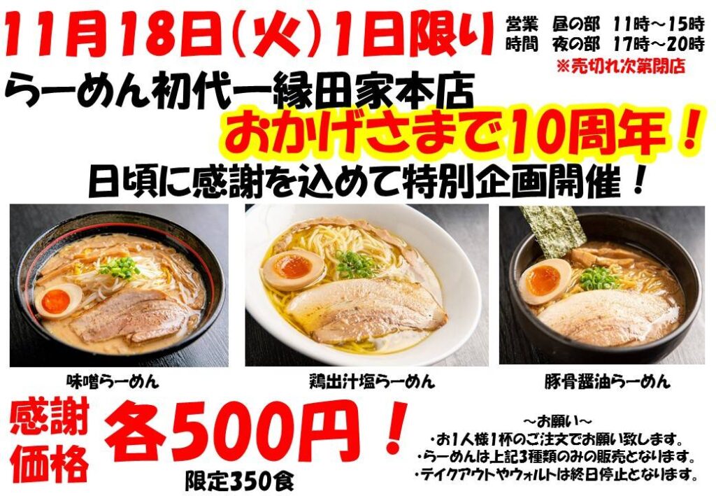 感謝価格500円!11月18日(1日限定) 掲載日:2025年11月11日 らーめん初代一縁 おかげさまで10周年! 日頃の感謝を込めて特別企画開催! 味噌ラーメン、鶏出汁塩ラーメン、豚骨醤油ラーメン 感謝価格 各500円!(限定350食) ※お一人様1杯ご注文でお願い致します。 ※ラーメンは上記3種類のみの販売となります。 ※テイクアウトやウォルトは終日停止となります。